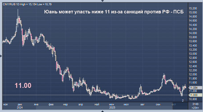 "Отметим, что, наряду с новым пакетом санкций, в пользу укрепления рубля может сыграть планируемое с 21 ноября введение США санкций против "Роснефти" и "ЛУКОЙЛа", способное дополнительно усилить предложение валюты со стороны экспортеров в начинающийся период подготовки к налоговым выплатам, - пишет эксперт в комментарии. - На фоне новых геовводных ждем повышения волатильности на валютном рынке. Причем видим риск теста курсом юаня нижней границы нашего текущего целевого диапазона 11-11,5 рубля за юань в конце месяца".