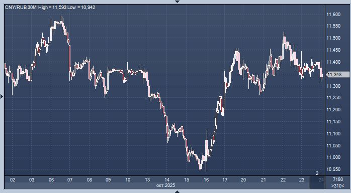 "Ожидаем в течение дня сохранения парой юань/рубль позиций в нашем краткосрочном целевом диапазоне 11-11,5 руб. за юань. В ходе торгов возможно смещение китайской валюты к его середине на фоне повышенного предложения со стороны экспортеров, которые готовятся к пику налоговых выплат, приходящемуся на 28 октября, - указывает эксперт в комментарии. - Плюс к этому рубль может получить дополнительную поддержку, если на заседании ЦБ РФ решит сохранить ключевую ставку неизменной. При этом в рамках нашего базового сценария мы ожидаем снижения ставки на 50-100 б.п., что инвесторы уже заложили в котировки национальной валюты".