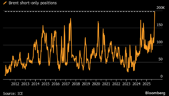Судя по всему, крупные спекулянты, вроде хедж-фондов, не только не заработали на недавнем взлете цен на нефть, но и понесли масштабные потери. По данным ICE Futures Europe*, на неделе до 21 октября — т. е. всего за несколько дней до введения Белым домом санкций против «Лукойла» и «Роснефти» — крупные спекулянты резко увеличили короткие позиции по нефти Brent, доведя их совокупный объем до исторического рекорда.