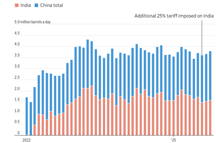 Импорт российской нефти в Китае и Индии. Источник: Wall Street Journal
