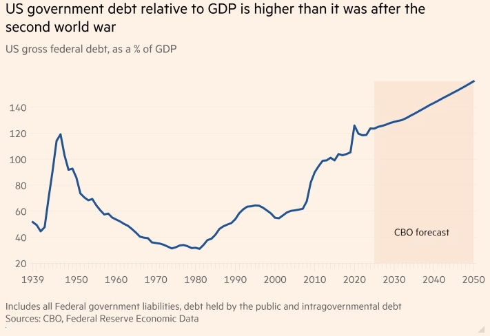 По оценкам МВФ, к концу десятилетия общий государственный долг США вырастет более чем на 20 процентных пунктов и достигнет 143,4 % от валового внутреннего продукта (ВВП) страны, превзойдя предыдущие рекорды, установленные после пандемии.