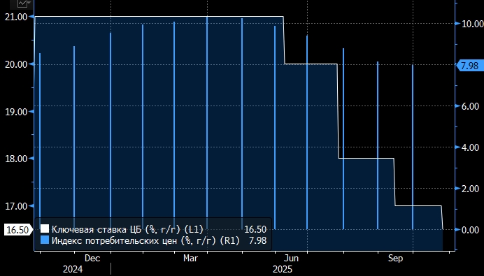 "Полагаем, что реализовать смягчение кредитных условий в ноябре или декабре 2025 года регулятору будет сложнее ввиду возможного нарастания сезонных проинфляционных факторов, с учетом ожидаемого эффекта со стороны роста НДС, тарифов и ряда других факторов, обусловленных влиянием принятого в первом чтении проекта федерального бюджета на 2026 год и плановый период 2027-2028 годов, - пишут эксперты. - Данная ситуация существенно формирует риск для наших кратко- и среднесрочных прогнозов. На этом фоне к концу 2025 года ожидаем значение ключевой ставки на отметке 16,5% против 16% ранее".