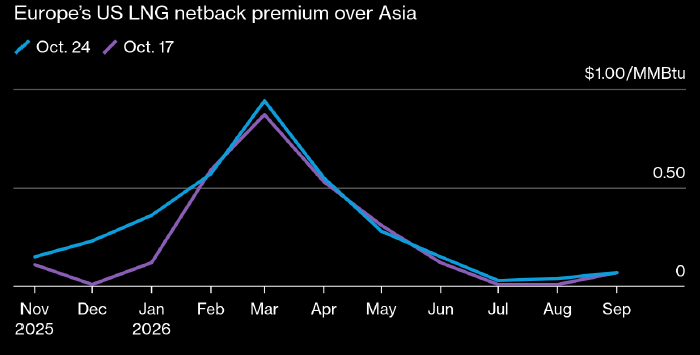 На неделе до 24 октября европейская премия для декабрьских и январских отгрузок подскочила сразу на $0,20 за MMBtu, что стало максимальным изменением для всех отрезков фьючерсных кривых на ближайший год. Вероятно, это отражает желание европейцев увеличить импорт СПГ из США на фоне аномальной погоды, которая может повысить спрос на топливо для обогрева и сократить генерацию электроэнергии из возобновляемых источников, полагают эксперты BloombergNEF.