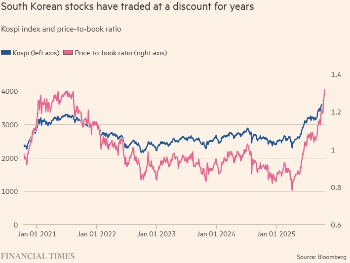 Южнокорейский рынок претерпел значительные изменения. На протяжении большей части последних трёх лет индекс Kospi торгуется с коэффициентом цена/балансовая стоимость ниже единицы, что означало, что акции компаний стоили дешевле их активов. Однако инвесторы начали пересматривать свои взгляды на страну.