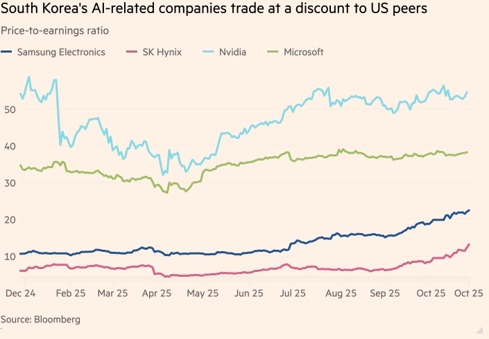 Южнокорейские компании, связанные с искусственным интеллектом, торгуют с дисконтом по сравнению с американскими аналогами. Коэффициент цены к прибыли. Самсунг Электроникс. СК Хайникс. Нвидиа. Майкрософт. Источник: Блумберг