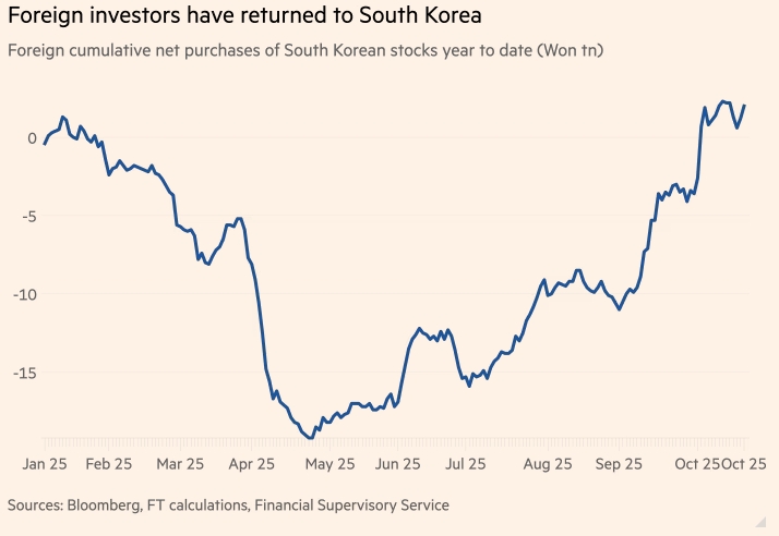 После того как в первой половине года иностранные инвесторы не проявляли интереса к южнокорейским акциям, во второй половине года они стали активными покупателями, приобретя акции на сумму 2 трлн вон (1,4 млрд долларов). Чонмин Шим из CLSA прогнозирует дальнейший приток средств, так как чистый объём иностранных покупок остаётся ниже уровня середины 2024 года. Несмотря на впечатляющие результаты, розничные инвесторы Южной Кореи практически не участвовали в рекордном ралли текущего года.