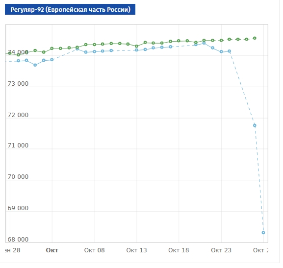 По информации Национального ценового агентства (НБЦА, Петербургская биржа), 27 октября объём продаж бензина значительно вырос. «Приток продукта и выбранная стратегия как продавцами, так и покупателями положительно повлияли на текущую динамику рынка автомобильного бензина. На многих базисах в биржевых стаканах наблюдались свободные предложения. Покупатели придерживались тактики, сложившейся в конце прошлой недели: выставляли цены ниже рыночных, не разбирая лоты сразу. Продавцы также снижали цены. Увеличение предложения бензина на бирже по сравнению с первой половиной октября способствует уменьшению остаточного спроса, но его уровень остаётся высоким», — отмечается в материалах НБЦА.