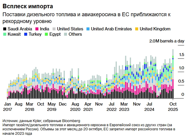 По данным Kpler, собранным Bloomberg, с 1 по 20 октября в порты ЕС поступило почти 1,9 миллиона баррелей топлива из Индии, Саудовской Аравии и США. При сохранении текущих темпов закупок эти объёмы могут стать рекордными за месяц.