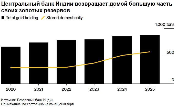 В настоящее время Центральный банк Индии располагает более чем 65% своих золотых резервов внутри страны, что значительно превышает показатель четырёхлетней давности. Это ускорило процесс возвращения драгоценного металла на родину после того, как западные страны заморозили российские резервы из-за СВО на Украине.