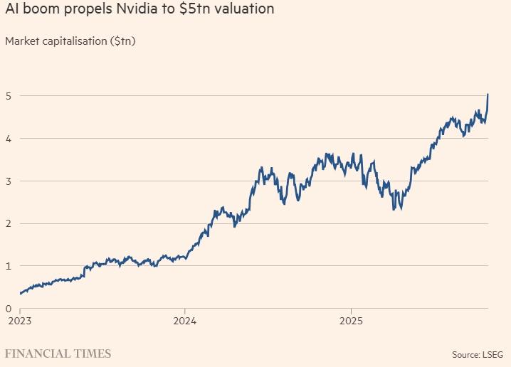 Nvidia стала первой в мире компанией с капитализацией в 5 трлн долларов после того, как её акции выросли на фоне высокого спроса на системы искусственного интеллекта и перспектив расширения присутствия на китайском рынке.