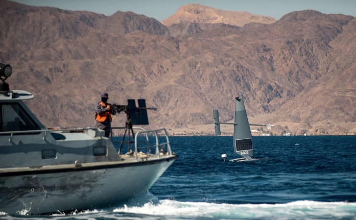 Беспилотный надводный корабль Saildrone Explorer проплывает мимо патрульного корабля Королевских ВМС Иордании, проводя учения по борьбе с незаконным промыслом во время международных морских учений Cutlass Express 2022 (IMX/CE22) с участием 60 стран в заливе Акаба, Иордания. Фотография сделана 9 февраля 2022 года и опубликована ВМС США 10 февраля 2022 года. Центральное командование ВМС США/2-й класс Доусон Рот/Распространено через REUTERS