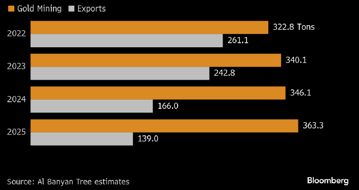 Оранжевым — добыча золота в РФ, серым — его экспорт из РФ (тонн в год). Данные: WGC (исторические данные), Al Banyan Tree Research (прогноз на 2025 год). Источник: Bloomberg