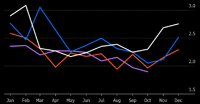 Экспорт нефтепродуктов из России по годам в млн б/д. Белым — 2022 г., голубым — 2023 г., красным — 2024 г., фиолетовым — 2025 г. Данные: Vortexa, источник: Bloomberg