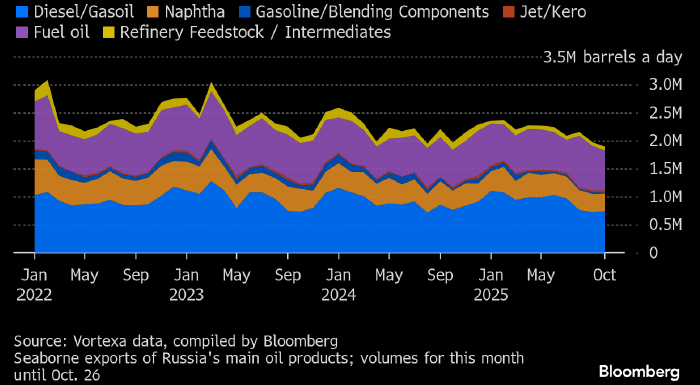 Согласно данным Vortexa, собранным Bloomberg, общий объем морских поставок нефтепродуктов в среднем составил 1,89 млн баррелей в сутки за первые 26 дней этого месяца, что является самым низким показателем как минимум с начала 2022 года. Даже несмотря на небольшой рост экспорта дизельного топлива, низкие отгрузки нафты и мазута, особенно из портов Балтики после атак на экспортный хаб Усть-Луга, оказали давление на общие потоки. Неблагоприятные погодные условия в регионе в последние дни также могли повлиять на работу портов.