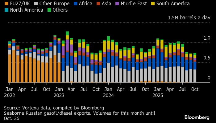 Экспорт дизеля/газойля из РФ: разбивка по регионам мира. Данные: Vortexa, источник: Bloomberg