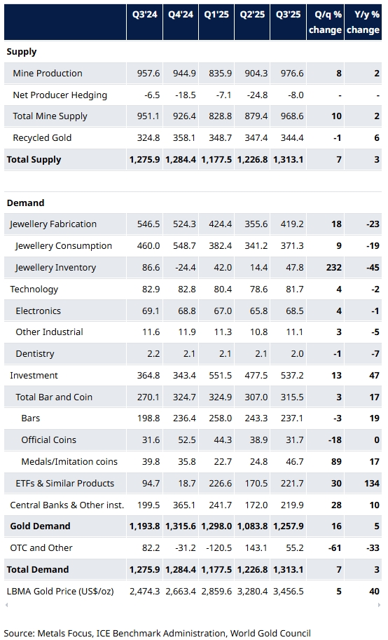 Приток средств в ETF, обеспеченные золотом, достиг 26 миллиардов долларов, во главе с фондами, зарегистрированными на бирже в Северной Америке, в то время как покупки центральными банками также ускорились в третьем квартале, при этом чистые покупки выросли на 28% по сравнению с предыдущим кварталом и на 10% в годовом исчислении.