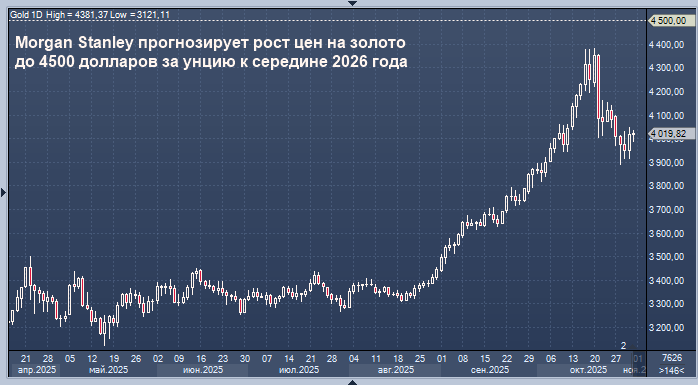 Morgan Stanley в пятницу заявил, что к середине 2026 года цены на золото могут достигнуть 4500 долларов за унцию. Это обусловлено высоким спросом со стороны биржевых инвестиционных фондов и центральных банков, а также сохраняющейся экономической неопределенностью.