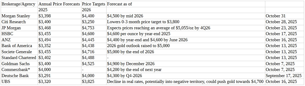 Ниже представлен список последних прогнозов аналитиков относительно цен на золото на 2025 и 2026 годы (в долларах США за унцию):