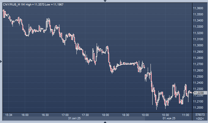 По итогам первой минуты торгов, курс юаня составил 11,2505 руб., что на 1 копейку меньше, чем на закрытии предыдущего дня. При этом китайская валюта оказалась на 9,03 копейки ниже официального курса.