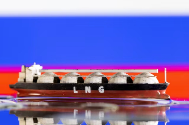 На этой иллюстрации, сделанной 19 мая 2022 года, модель танкера для перевозки СПГ изображена на фоне российского флага. REUTERS/Dado Ruvic/Иллюстрация. Приобретение лицензионных прав, открывается новая вкладка