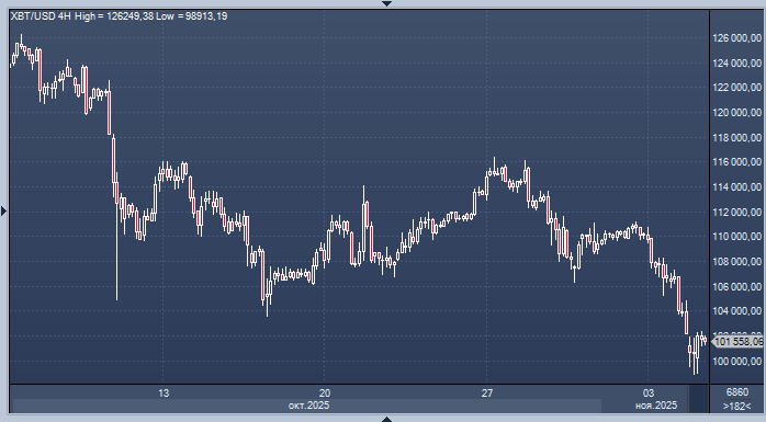 Во вторник стоимость первой криптовалюты снизилась на 7,4%, опустившись ниже отметки в $100 000 впервые с июня. Это падение более чем на 20% от рекордного максимума, установленного месяц назад. В среду утром цена биткоина немного восстановилась, но всё ещё остаётся на низком уровне.
