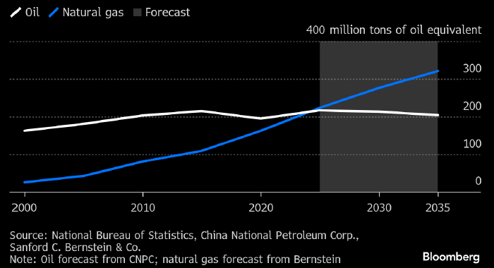 Добыча нефти (белым) и природного газа (голубым) в Китае (млн тонн нефтяного эквивалента). Исторические данные и прогноз. Источник: Bloomberg