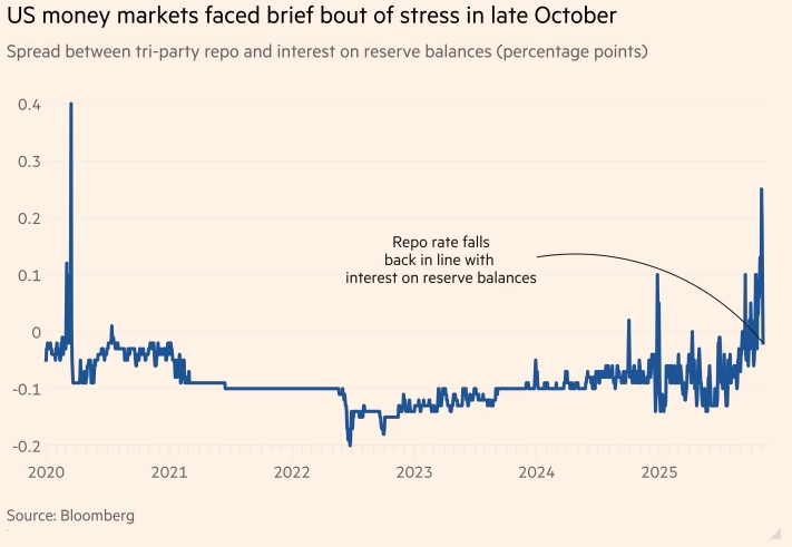 Денежные рынки США пережили кратковременный стресс в конце октября. Спред между трехсторонним репо и процентами по остаткам резервов (процентные пункты). Ставка РЕПО снижается до уровня процентных ставок по резервным остаткам. Источник: Блумберг