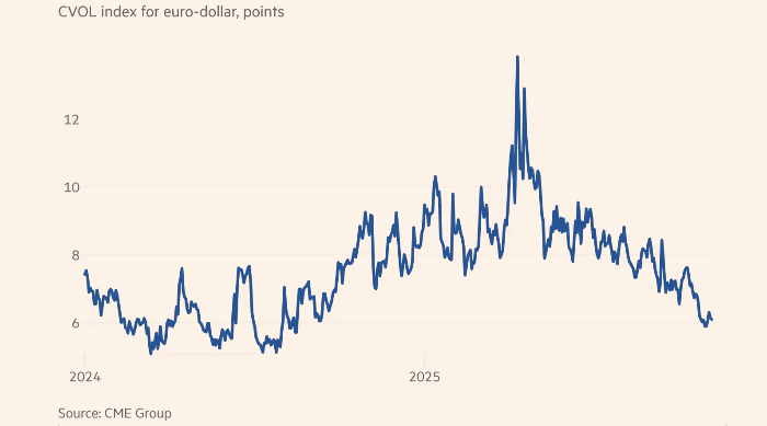 Прогнозы по колебаниям курса доллара опустились до минимумов более чем за год — рынки, по сути, вышли из фазы «шока Трампа», вызванного его победой на выборах и резкими тарифными шагами его администрации в начале года.