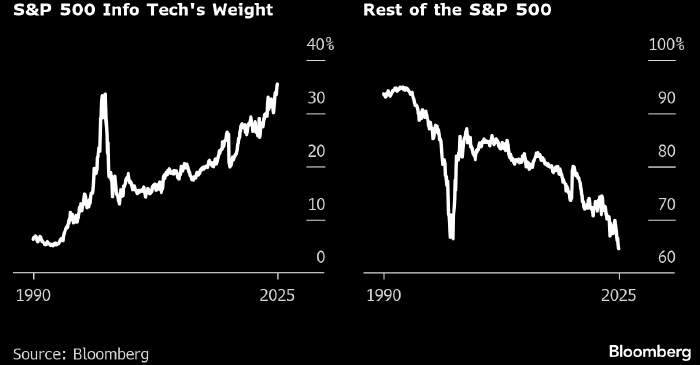 «Вес» акций технологических компаний в S&P 500 превысил 35%, преодолев показатель марта 2000 года на уровне 34,88% — месяца, когда лопнул пузырь доткомов. Соответственно, совокупная доля других секторов в индексе опустилась до нового рекордного минимума.