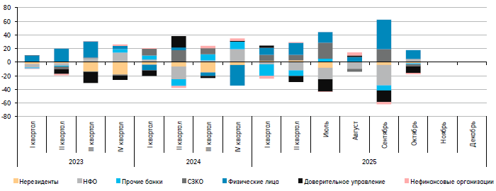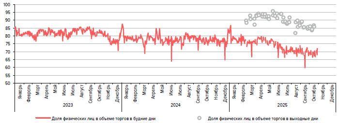 «На вторичных биржевых торгах акциями крупнейшими нетто-покупателями остаются розничные инвесторы (приобрели акций на 13,3 млрд руб.), однако они снизили объемы покупок относительно предыдущего месяца (в сентябре — 43,1 млрд руб.). Крупнейшими нетто-продавцами стали НФО в рамках доверительного управления и СЗКО, которые реализовали бумаг на 9,6 млрд и 2,9 млрд руб. соответственно», — говорится в опубликованном вечером понедельника Банком России «Обзоре рисков финансовых рынков». — «…Средняя доля физических лиц в торгах в октябре составила 69,0%, в то время как в среднем за предыдущие 12 месяцев — 75,0%. За III квартал 2025 г. показатель не превышал 70,5%, что говорит об устойчивом снижении доли розничных инвесторов и росте доли со стороны банков и НФО».