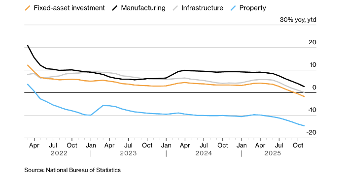 По данным национального бюро статистики, капвложения в основные средства за 10 месяцев сократились на 1,7% — рекордное снижение для этого периода. По оценке Bloomberg Economics, в октябре инвестиции упали примерно на 12%, продлив полосу сокращений до пяти месяцев подряд. Промпроизводство в октябре выросло на 4,9% год к году — минимальный прирост с начала года и ниже медианы прогноза (5,5%) в опросе Bloomberg.