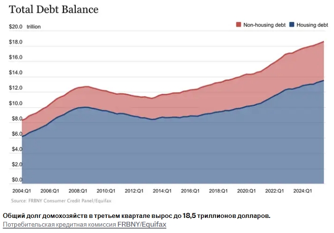 Кроме того, общий долг домохозяйств в США продолжает расти. По данным Федерального резервного банка Нью-Йорка, за третий квартал он увеличился на 197 миллиардов долларов, достигнув 18,5 триллионов долларов.
