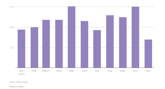 В прошлом месяце экспорт авиатоплива из Северо‑Восточной Азии на западное побережье США достиг пятимесячного максимума около 600 000 тонн, показывают данные Kpler. Объемы, в основном из Южной Кореи, Тайваня, Китая и Японии, выросли, поскольку покупатели на Западе пополняют запасы в Азии из‑за дефицита на местном рынке.
