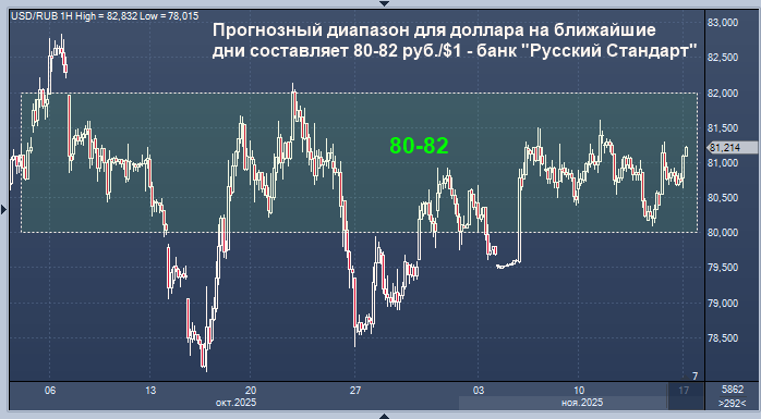 Прогнозный диапазон для доллара на ближайшие дни составляет 80-82 руб./$1, для евро - 93-95 руб./EUR1, говорится в комментарии директора департамента операций на финансовых рынках банка "Русский Стандарт" Максима Тимошенко.