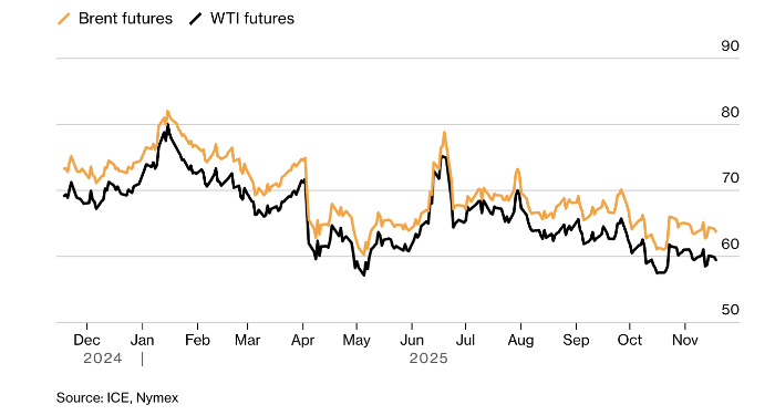 Нефть марки Brent торговалась ниже $64 за баррель после умеренного снижения накануне, WTI обосновалась на уровне $59. Цена российской эталонной нефти опустилась к минимуму более чем за два года — за несколько дней до вступления в силу санкций США против «Роснефти» и «Лукойла». Немедленный спред WTI (prompt) составляет 5 центов в бэквордации, при этом на прошлой неделе он ненадолго переворачивался в «медвежью» структуру контанго.