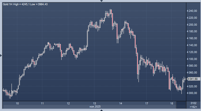 На спотовом рынке золото потеряло в цене 0,3%, опустившись до $4033,29 за унцию к 09:09 по Гринвичу. Это стало минимумом с 10 ноября прошлого года.
