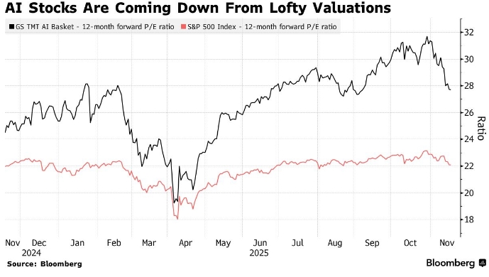Фондовые рынки уже начали проявлять признаки напряжения после того, как индекс MSCI All-Country World вырос на 17% в текущем году. Инвесторы опасаются возможного пузыря на рынке акций компаний, занимающихся искусственным интеллектом. Индекс S&P 500 сейчас примерно на 3% ниже своего пика, достигнутого в октябре, а трейдеры свопами снизили ставки на снижение процентной ставки Федеральной резервной системы в декабре.