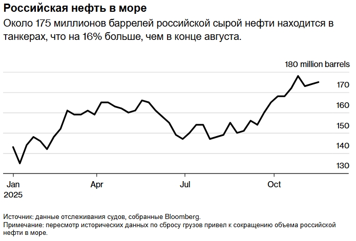 В прошлом почти все эти грузы отправлялись в Индию или Китай, но более жёсткие санкции США могут удержать эту нефть в море до тех пор, пока российские продавцы не найдут обходные пути.
