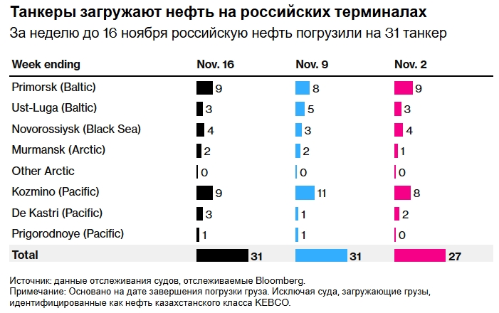 За неделю, закончившуюся 16 ноября, 31 танкер загрузил 23,06 миллиона баррелей российской нефти, что немного меньше, чем 23,43 миллиона баррелей, перевезённых тем же количеством судов на предыдущей неделе.