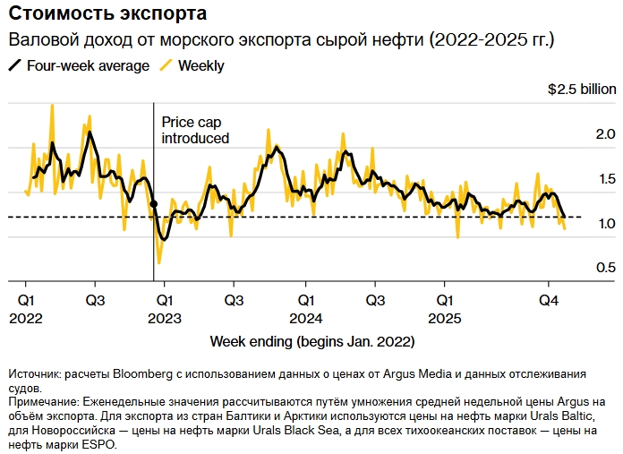 Морские поставки сырой нефти из России уменьшились на протяжении четвёртой недели, что способствовало снижению цен на нефть внутри страны и уменьшению доходов бюджета до самого низкого уровня за последние два с половиной года — около 1,2 миллиарда долларов в неделю.