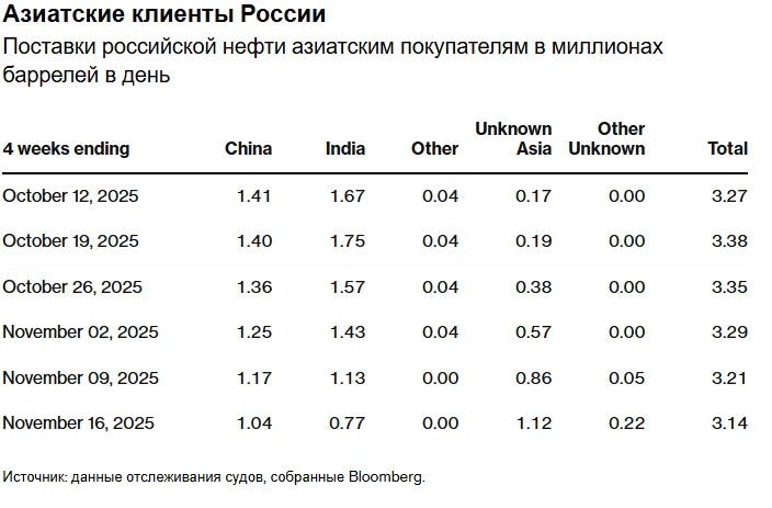 Поставки российским клиентам в Азии, включая суда без конечного пункта назначения, снизились до 3,14 миллиона баррелей в день за четыре недели до 16 ноября по сравнению с пересмотренными 3,21 миллиона за период до 9 ноября. Объёмы российской сырой нефти, отправляемой в Китай и Индию, резко сокращаются. Однако на судах всё ещё остаётся большое количество нефти без конечного пункта назначения, что может изменить эту динамику. Танкеры всё чаще не указывают конечный пункт назначения, пока не пройдут достаточно далеко через Аравийское море, а некоторые не указывают его даже после швартовки для разгрузки.
