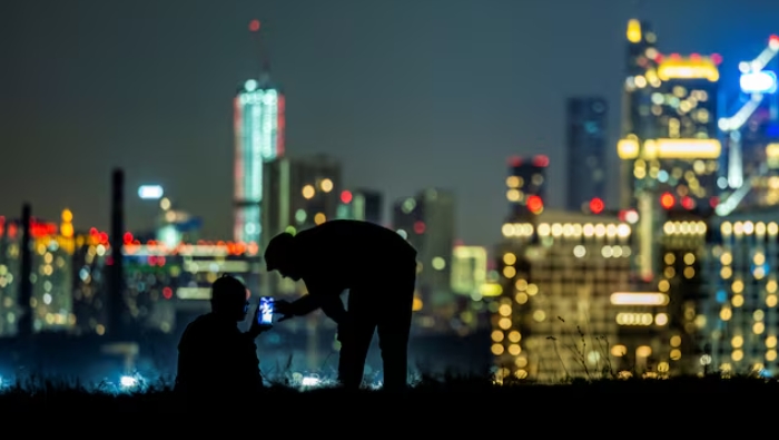 Двое мужчин пользуются смартфоном на фоне городского пейзажа в Москве, Россия, 17 сентября 2024 года. REUTERS