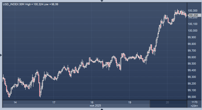 Индекс доллара, отслеживающий курс американской валюты по отношению к основным мировым валютам, поднялся до 100,26, установив шестимесячный максимум. После публикации протокола ФРС индекс вырос на 0,5%.