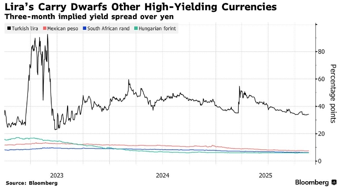 Однако высокая потенциальная доходность привлекает многих мелких японских инвесторов, известных своей готовностью рисковать на валютных рынках. Лира предлагает трёхмесячную доходность более 30% по отношению к иене, что значительно выше, чем у других валют, таких как мексиканское песо или южноафриканский рэнд.