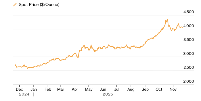 UBS улучшил прогноз несмотря на то, что золото вошло в фазу консолидации после достижения рекордного максимума почти в $4381 за унцию ровно месяц назад. С тех пор золото в основном торговалось в диапазоне $4000-$4100, за исключением краткого всплеска почти до $4200 в середине ноября.