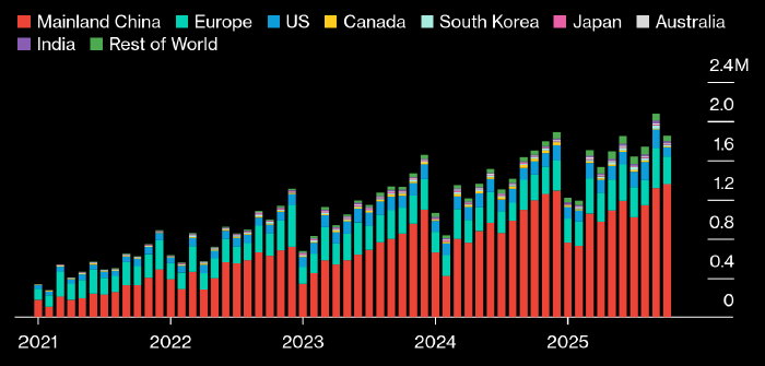 Продажи электромобилей по странам и регионам мира (млн штук в месяц). Источник: Bloomberg