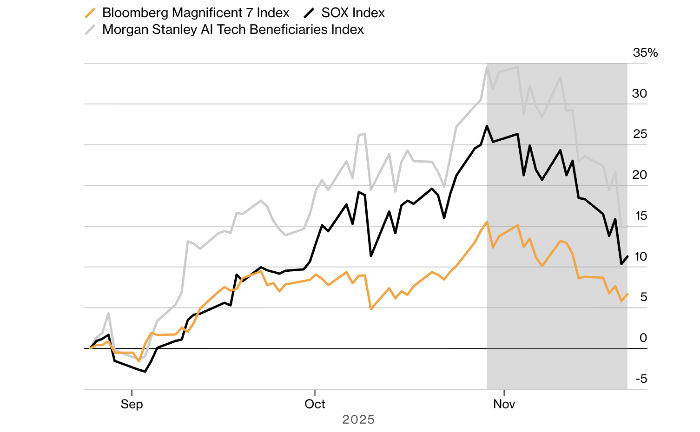 Акции компаний, связанных с ИИ, упали от пиковых значений. Источник: Bloomberg