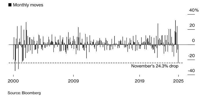 Тем не менее, за пределами Nvidia другие полупроводниковые компании внезапно столкнулись с трудностями, поскольку Уолл-стрит ставит под сомнение долговечность расходов на ИИ. Индекс акций, связанных с чипами, в ноябре упал на 11% и движется к худшему месяцу с 2022 года, а акции таких компаний, как Advanced Micro Devices и Arm Holdings, просели более чем на 20%.