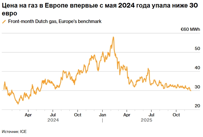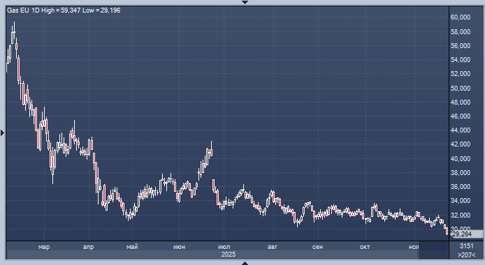 Фьючерсы на газ достигли самого низкого уровня с мая 2024 года после нескольких недель низкой торговли. С начала года они упали на 39%. Ожидается, что в начале декабря температура превысит сезонную норму, что снизит спрос на отопление и, соответственно, цены. Инвестиционные фонды также сократили свои оптимистичные прогнозы по европейскому газу.