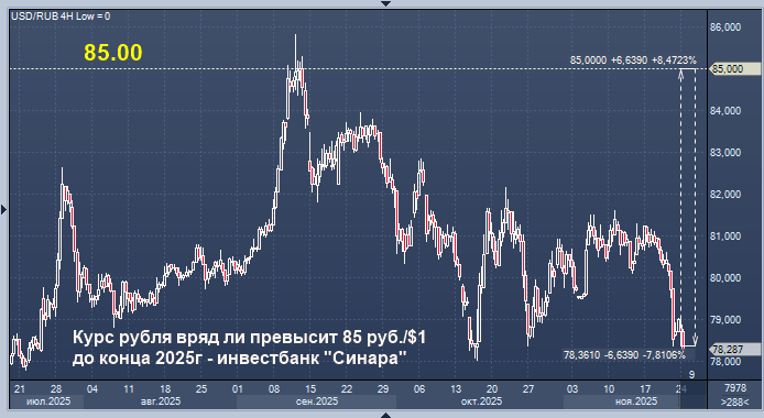 "Если учесть целый набор этих временных факторов, курс пары USD/RUB, весьма вероятно, до конца года останется ниже, чем мы предполагали в 3К25. На фоне большего притока капитала в октябре и, вероятно, в ноябре теперь считаем, что до конца 2025 года он вряд ли превысит отметку 85 руб./$1", - заключают аналитики инвестбанка.
